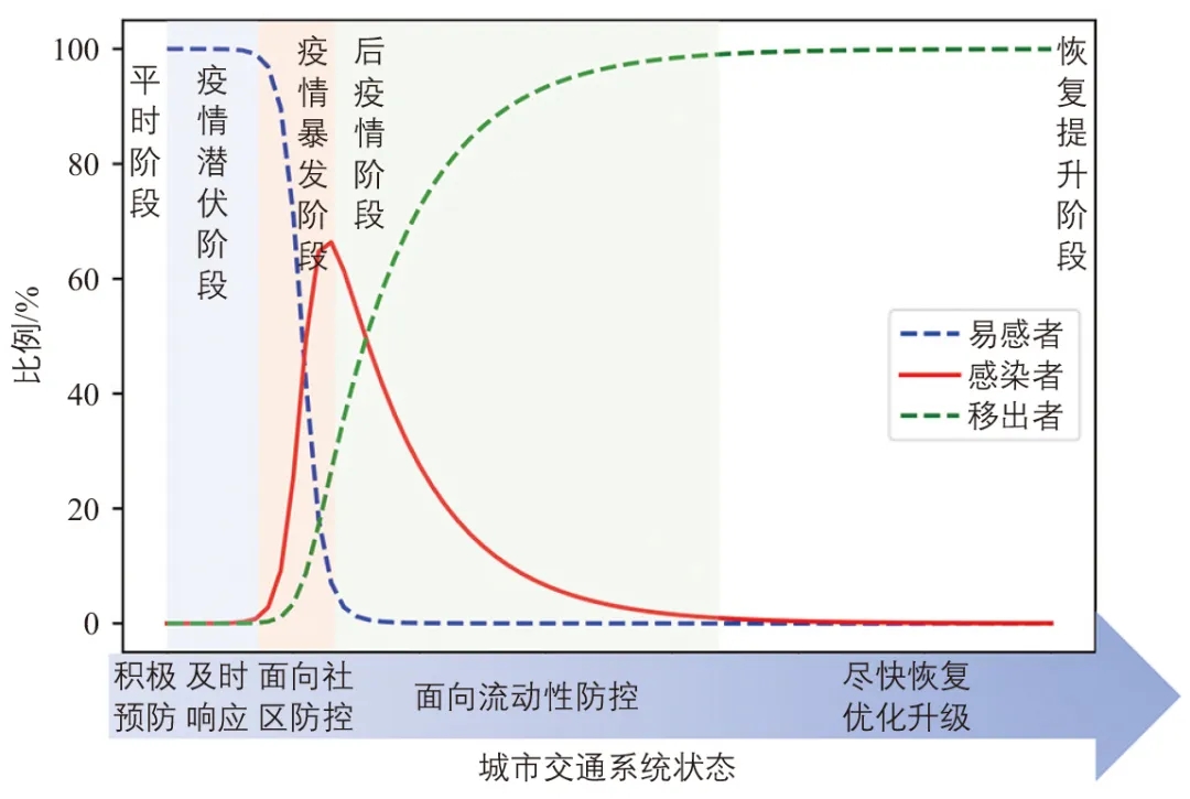 疫情不同發(fā)展階段的差異性較大,城市交通系統(tǒng)不能只適應一種狀態(tài),而應具備韌性,在平時預防準備,在疫情干擾下可迅速從常態(tài)切換至緊急狀態(tài),促使系統(tǒng)盡快恢復、優(yōu)化、升級,達到更高層次的穩(wěn)定狀態(tài),以預防和應對未來更強的沖擊。每次疫情發(fā)生對于城市交通系統(tǒng)不是簡單重復而是螺旋式進化,每循環(huán)一次城市防疫交通系統(tǒng)的韌性將會有所提升。本文通過對由新發(fā)傳染病(Emerging Infectious Diseases)構成的重大突發(fā)公共衛(wèi)生事件在不同階段的城市交通供給特征、居民出行需求及防疫需求等方面差異性進行分析,并基于韌性理論提出針對不同階段的提升策略,以增強城市交通系統(tǒng)的韌性及城市免疫力。