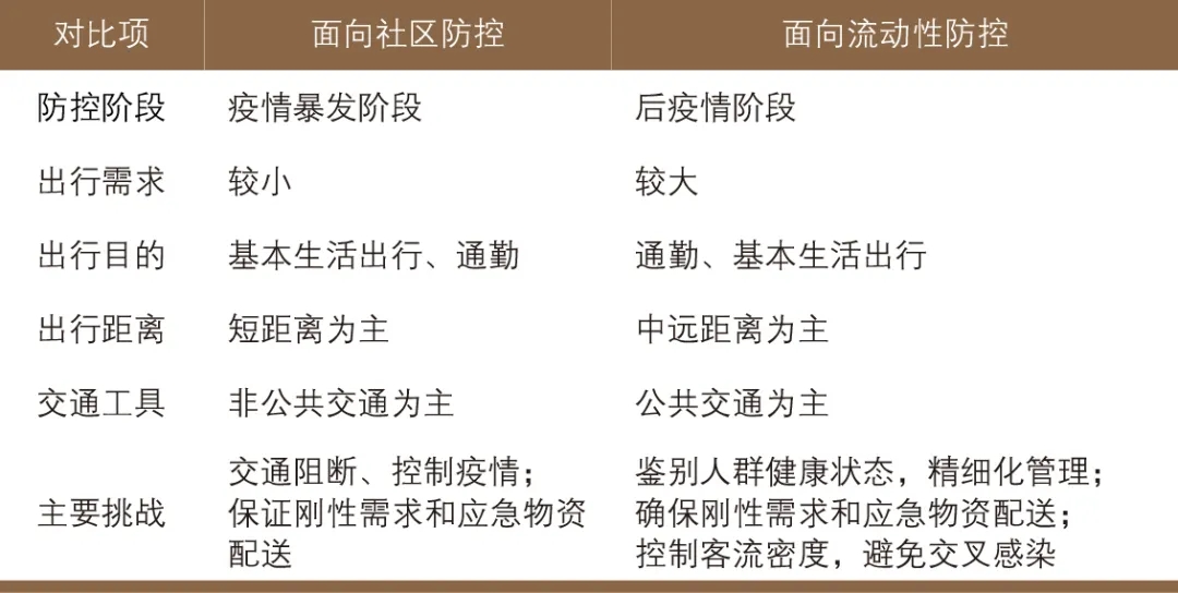 4)后疫情階段,此階段新增感染者數(shù)量將逐漸減少,現(xiàn)存感染者比例達到峰值后開始下降,移出者比例全面增加,但疫情尚未完全結(jié)束。如果繼續(xù)執(zhí)行封鎖和阻斷等交通措施,會因長時間停擺付出更大的社會經(jīng)濟代價。此時城市交通系統(tǒng)應綜合考慮城市間返程和城市內(nèi)人員復工、復產(chǎn)、復學等因素,逐步由面向社區(qū)防控向面向流動性防控轉(zhuǎn)變,其特點在于:①居民出行需求逐漸增加,且以通勤交通為主;②公共交通將成為城市居民主要的交通方式;③乘客眾多的公共交通場所成為易感場所。兩種防控方式的具體對比如下表所示。