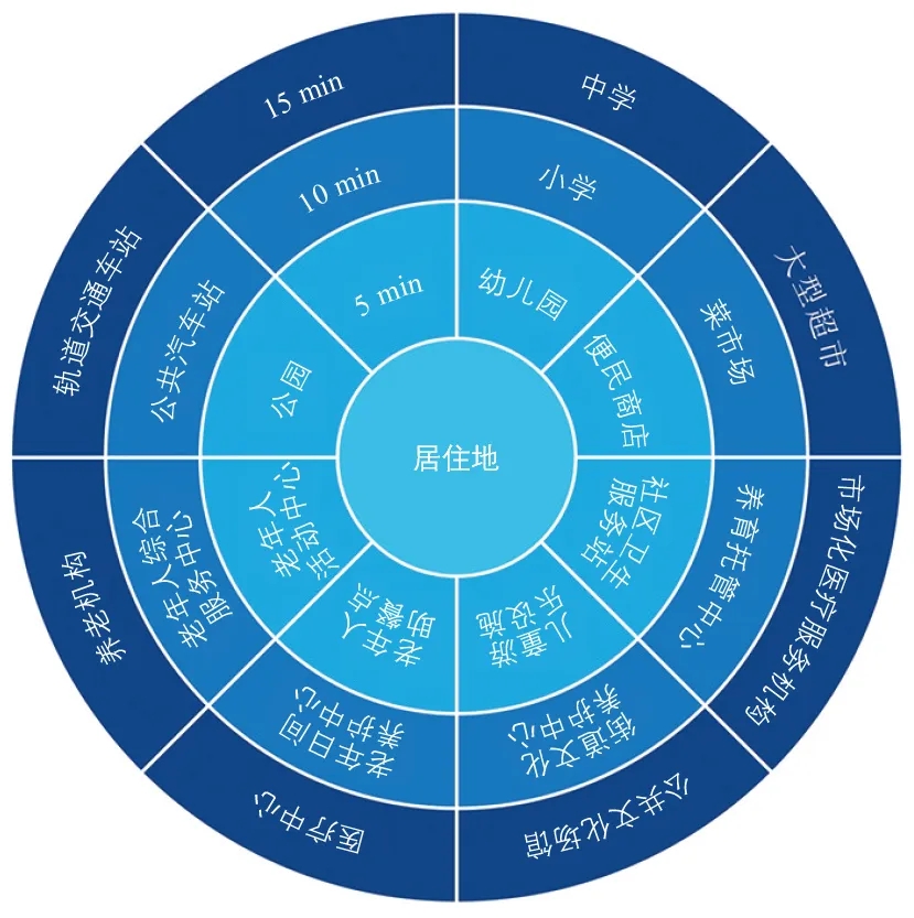 韌性系統(tǒng)應是分散而非集中的,應由小的、半自治單元、標準化作業(yè)構成[18]。15 min生活圈,即在居民15 min 步行可達的范圍內(nèi),配備生活所需的服務功能和公共場所空間(見下圖),其不僅為居民提供豐富、便捷可達的社區(qū)服務和更多的就近就業(yè)機會[19],且將城市離散化,使社區(qū)變?yōu)槌鞘凶钚卧,有效提升居民出行的步行友好性和出行便捷性。從而既可有效減少平時階段居民的中長距離出行,體現(xiàn)綠色環(huán)保特性,又可保證疫情期間居民的基本生活不受影響,同時對疫情傳播有一定隔離作用。