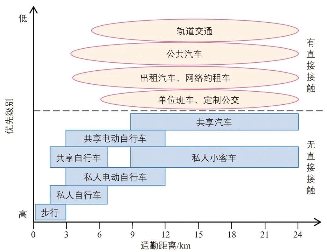 城市交通系統(tǒng)載運工具多樣性可提升其韌性和防疫性能。雖在平時階段倡導環(huán)保高效的公共交通,但對其他交通工具不能忽視或歧視,每種交通工具都有其相應的優(yōu)勢及適用場景。在疫情下,可根據(jù)是否直接接觸將交通工具分類,并根據(jù)出行距離為居民通勤出行推薦相應優(yōu)先出行方式[20](見下圖)。因此,在平時階段應對其他交通工具積極引導,促使其向綠色環(huán)保、安全高效的方向發(fā)展。此外,在道路規(guī)劃時要重視對各類交通工具的友好性,一種交通工具癱瘓其他交通工具可及時順利上路作為補充。
