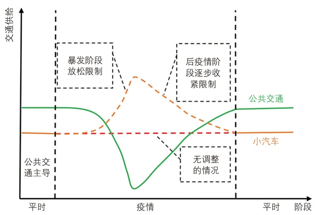 通過動態(tài)調(diào)整城市交通供給可緩解上述問題。疫情暴發(fā)階段居民整體出行頻率變低,城市道路狀況變好,可通過適當放寬小汽車限行、適當減免城市停車費用等措施擴大小汽車等出行的供給,從而保障居民基本需求。到后疫情階段隨著公共交通系統(tǒng)恢復,再逐步收緊限制轉(zhuǎn)至公共交通主導階段,從而實現(xiàn)對疫情下缺失的交通供給進行有效補充,維持城市正常運轉(zhuǎn)和居民正常生活(見下圖)。在新冠肺炎疫情暴發(fā)期間,河南洛陽就率先推出7座及以下小型客車在市區(qū)內(nèi)不執(zhí)行尾號限行政策,此后,開封、南陽等地也紛紛執(zhí)行尾號不限行措施。