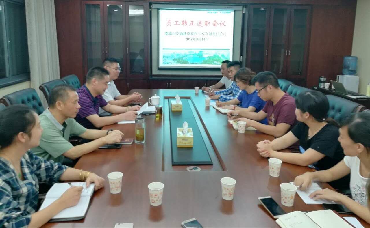 8月14日晚,市交建投第一批新員工轉(zhuǎn)正述職會(huì)議在公司會(huì)議室舉行。5名擬轉(zhuǎn)正員工運(yùn)用PPT,從個(gè)人工作情況、自身不足和下一步工作計(jì)劃等方面進(jìn)行轉(zhuǎn)正述職,并接受同事和領(lǐng)導(dǎo)評(píng)議。